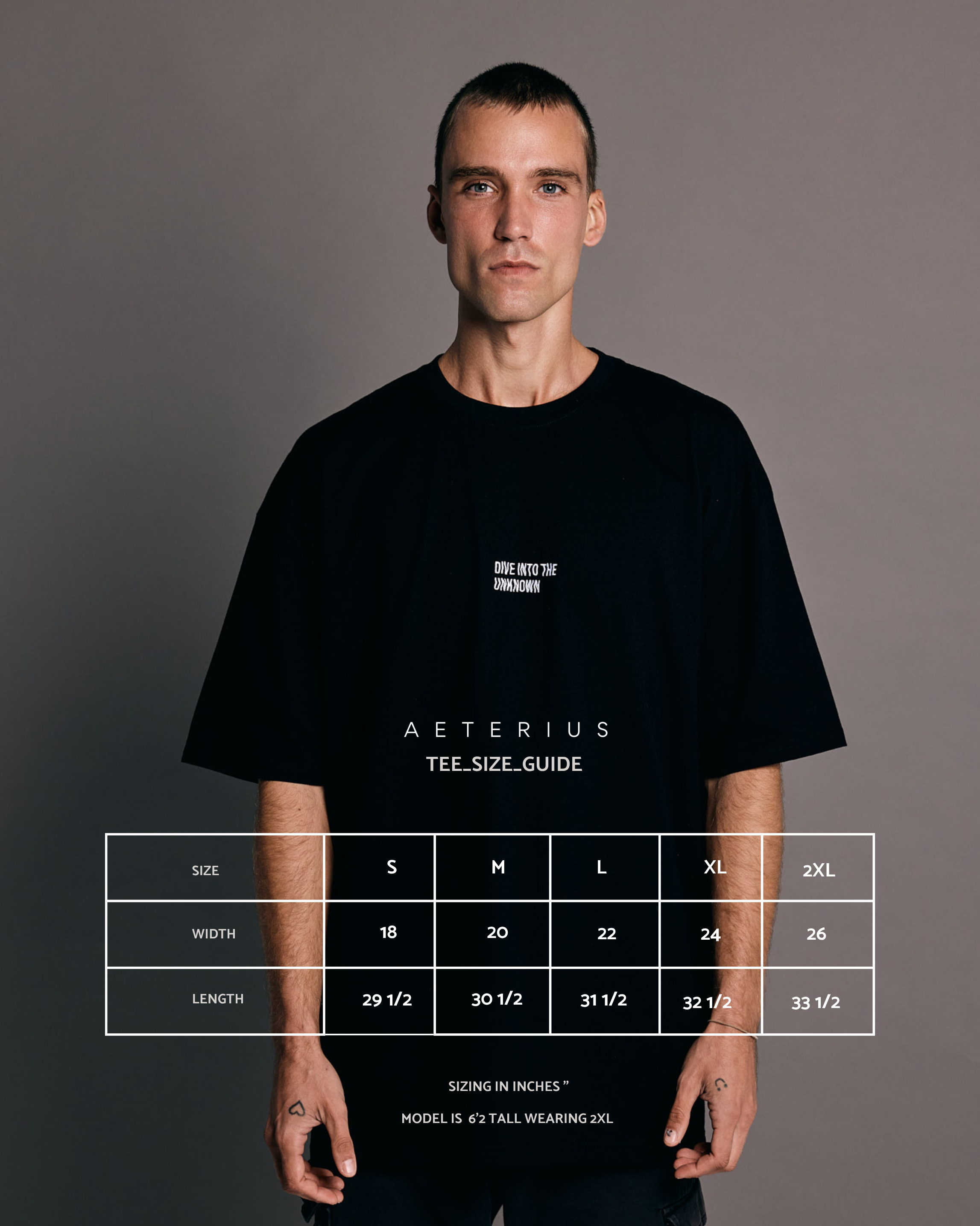 Size up for the intended drop shoulder look. Model 6'2 tall wearing 2XL.