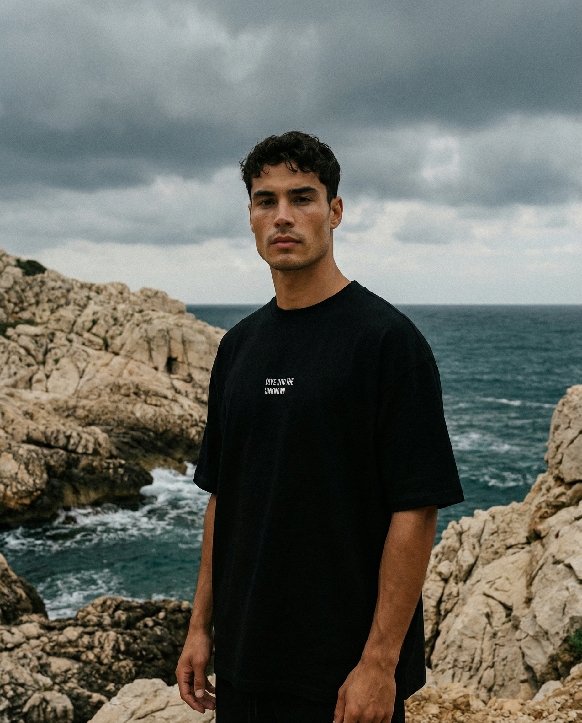 Dive Into The Unknown, the luxury heavy cotton black t-shirt with a luxurious central embroidery. Absolute minimalism, a deeper level in streetwear. Size up for drop shoulder/oversized t-shirt effect.