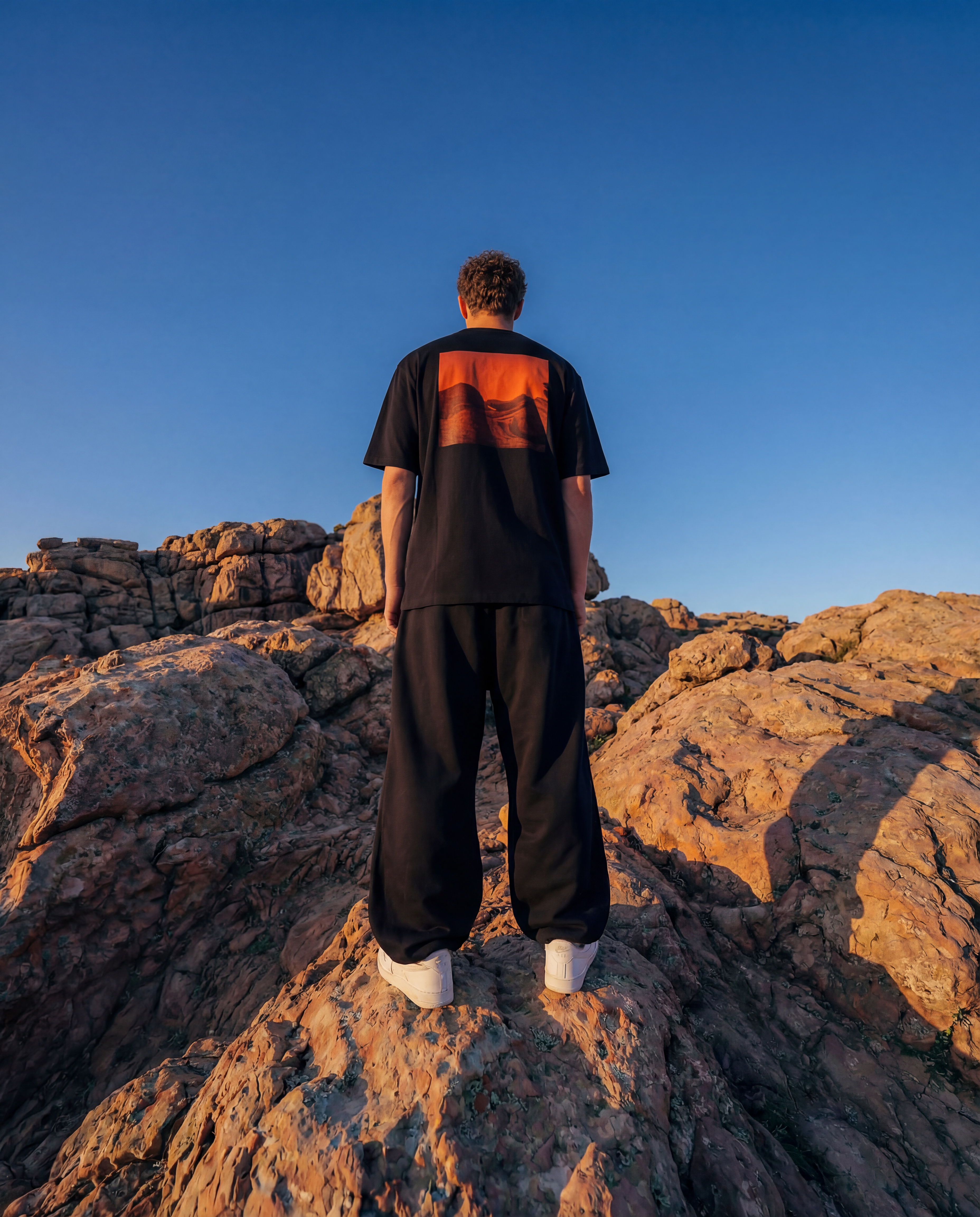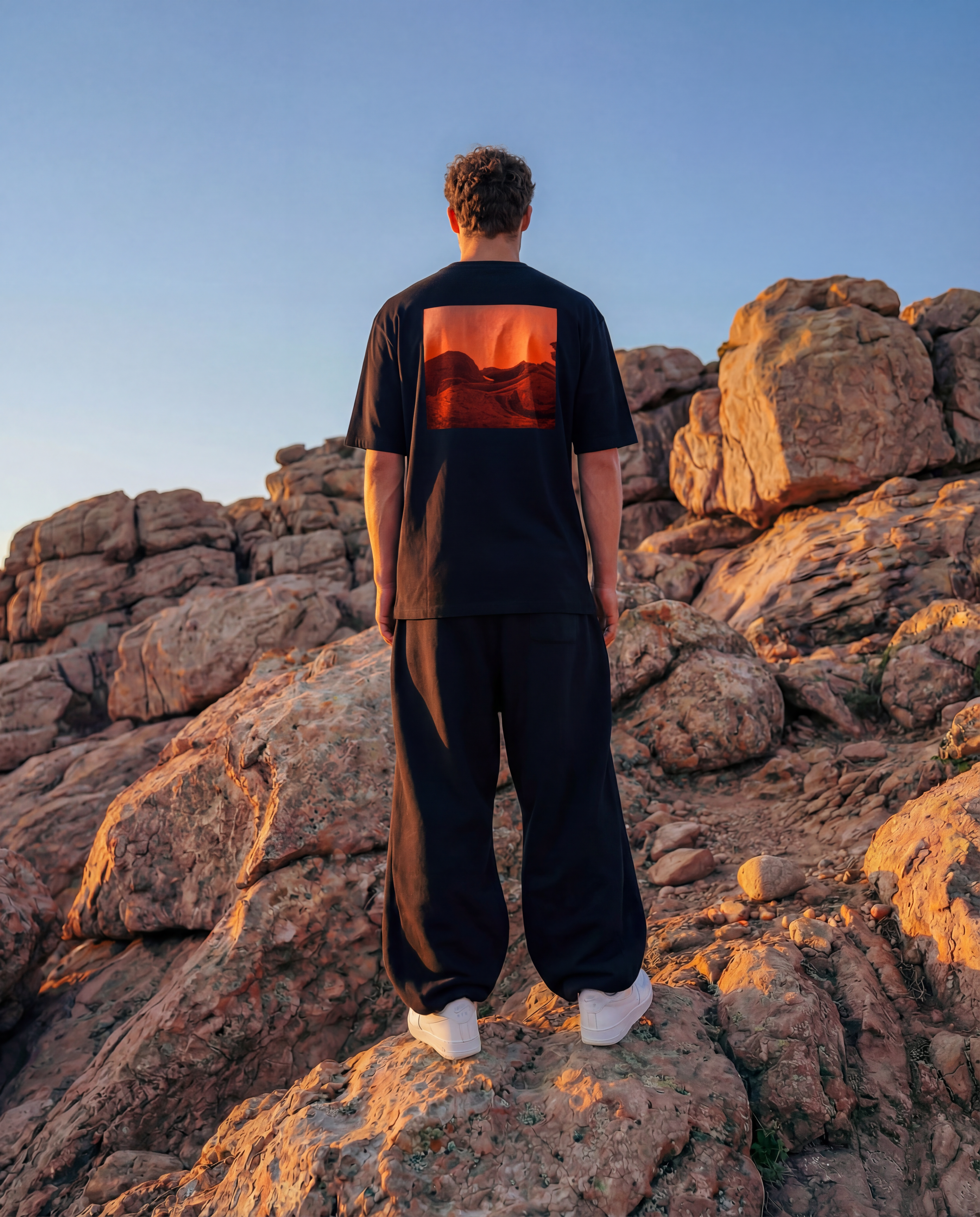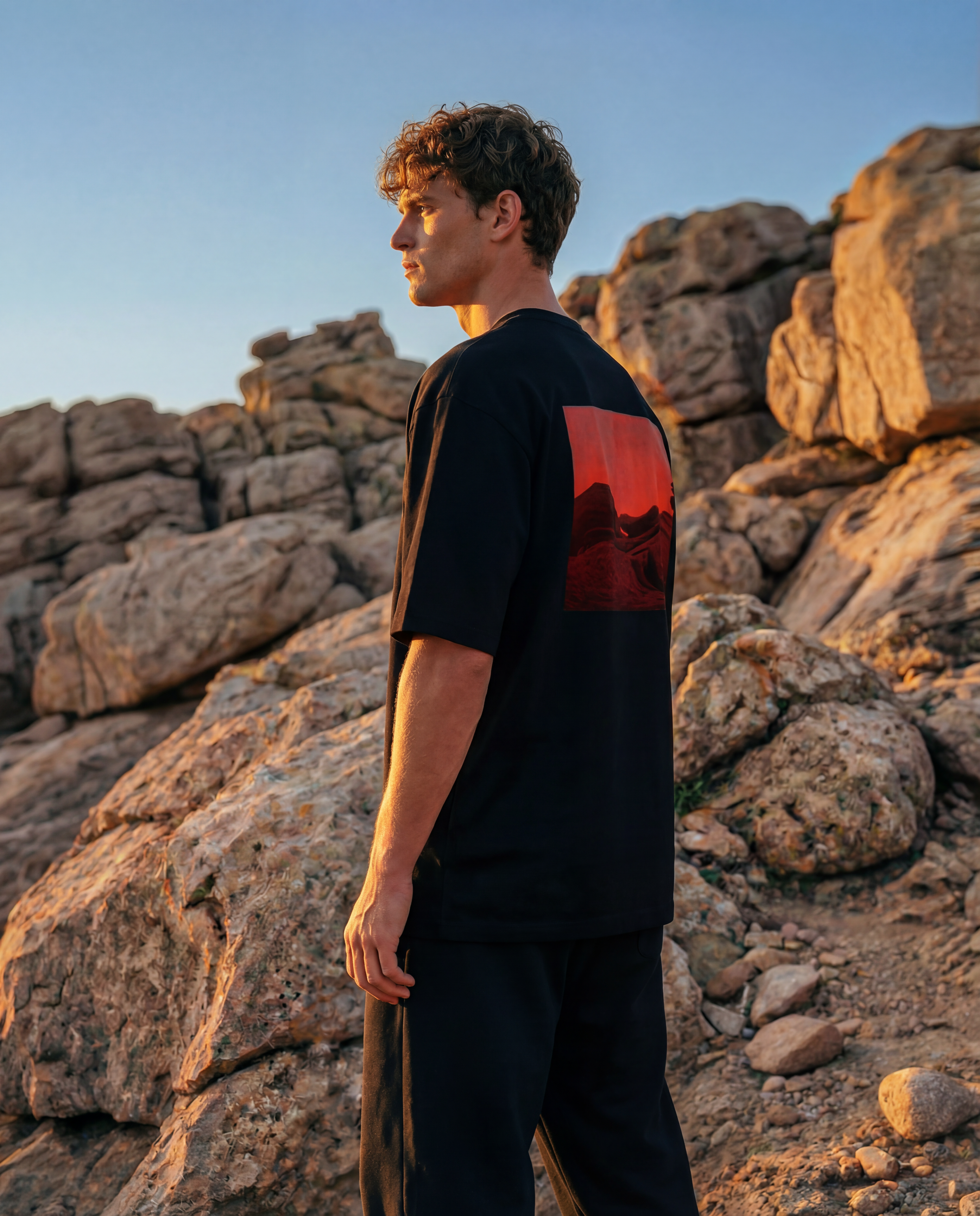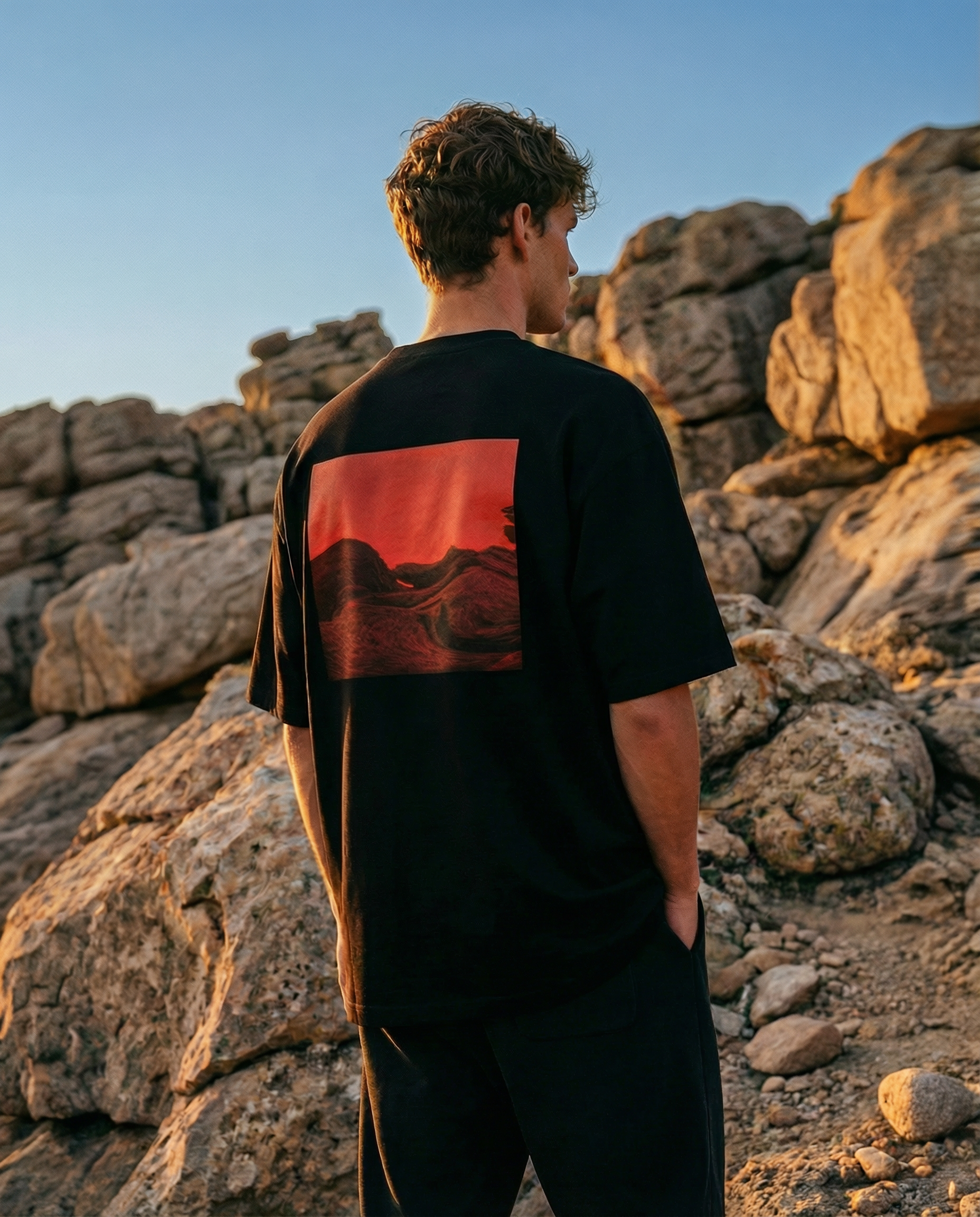Person wearing an oversized black t-shirt with drop shoulder sleeves, red graphic back print, gradient background in luxury streetwear urban clothing aesthetic AETERIUS